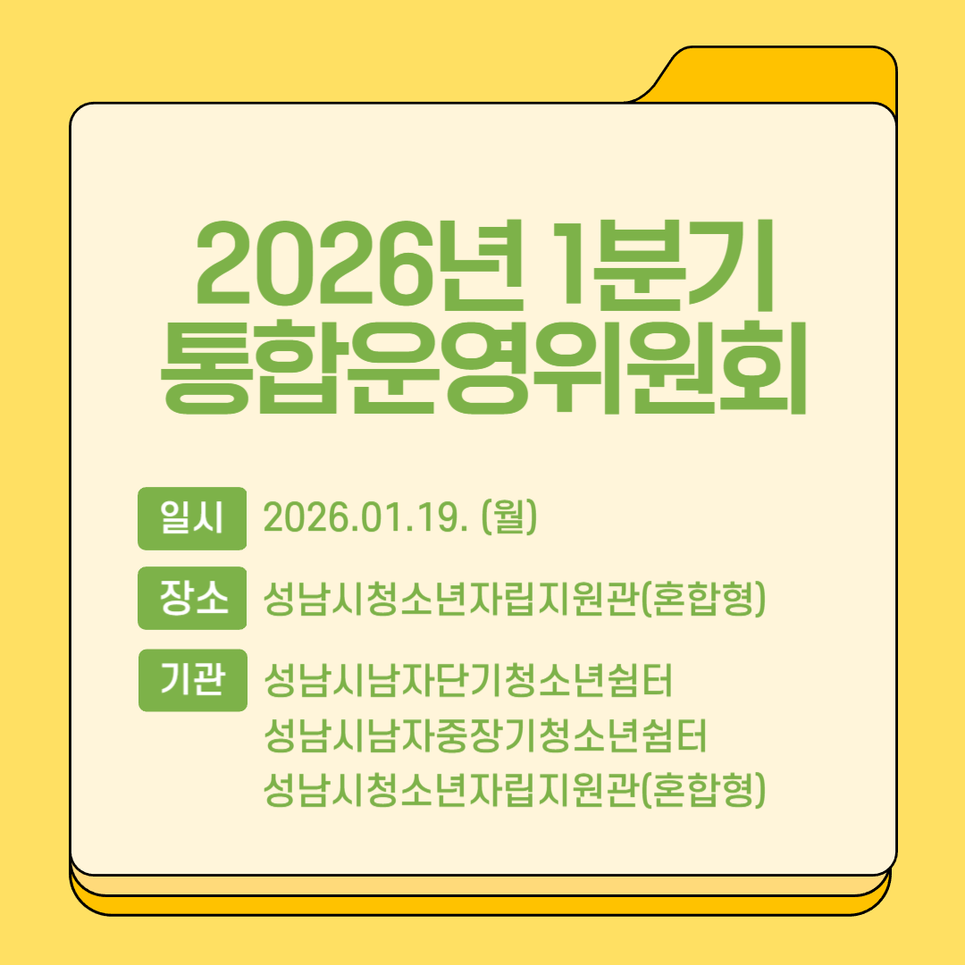 지난 19일(월), 성남시청소년자립지원관(혼합형)은 성남시남자단기청소년쉼터, 성남시남자중장기청소년쉼터와 함께 2026년 1분기 통합운영위원회를 개최하였습니다.