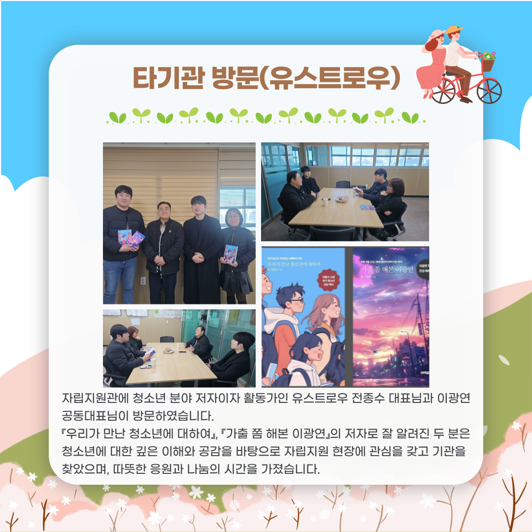 ✅ 외부협력 ✔️ 심리상담기관 헬로스마일과의 업무협약 체결 ✔️ 경기도 자립지원관 워크숍 참여 ✔️ 지자체 기관 방문 및 유관기관 연계 ✔️ 타기관 교류 방문 – 유스트로우
