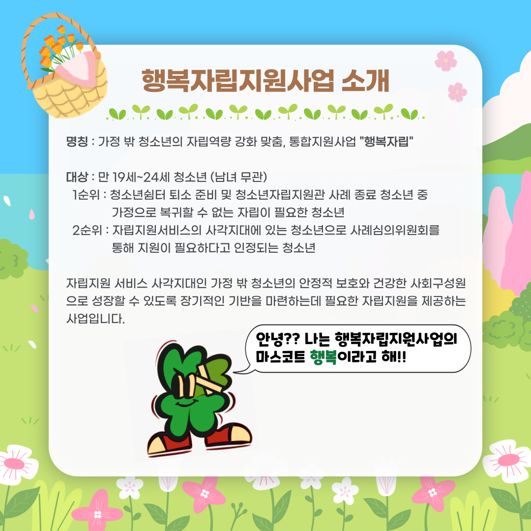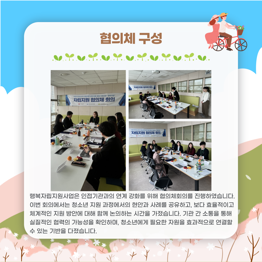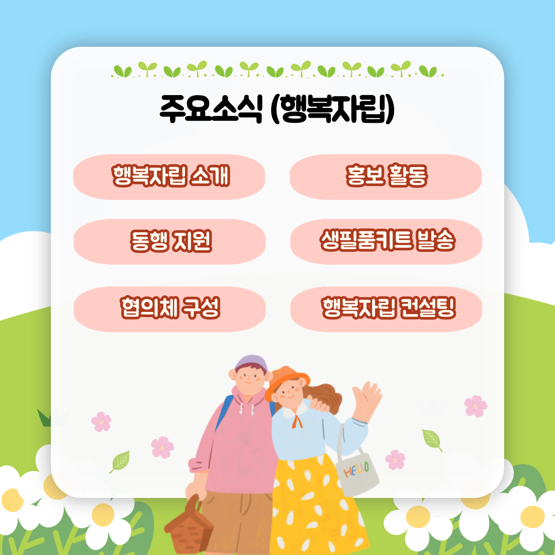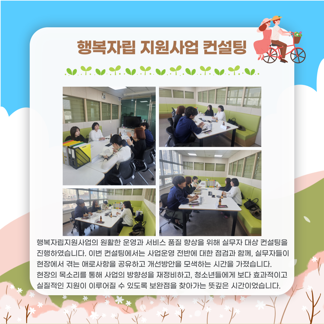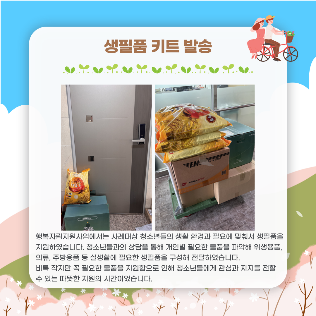 ✅ 행복자립지원사업 ✔️ 청소년 대상 홍보활동 진행 ✔️ 협의체 구성 및 정기회의 운영 ✔️ 생필품키트 발송을 통한 맞춤형 지원 ✔️ 실무자 대상 컨설팅 실시